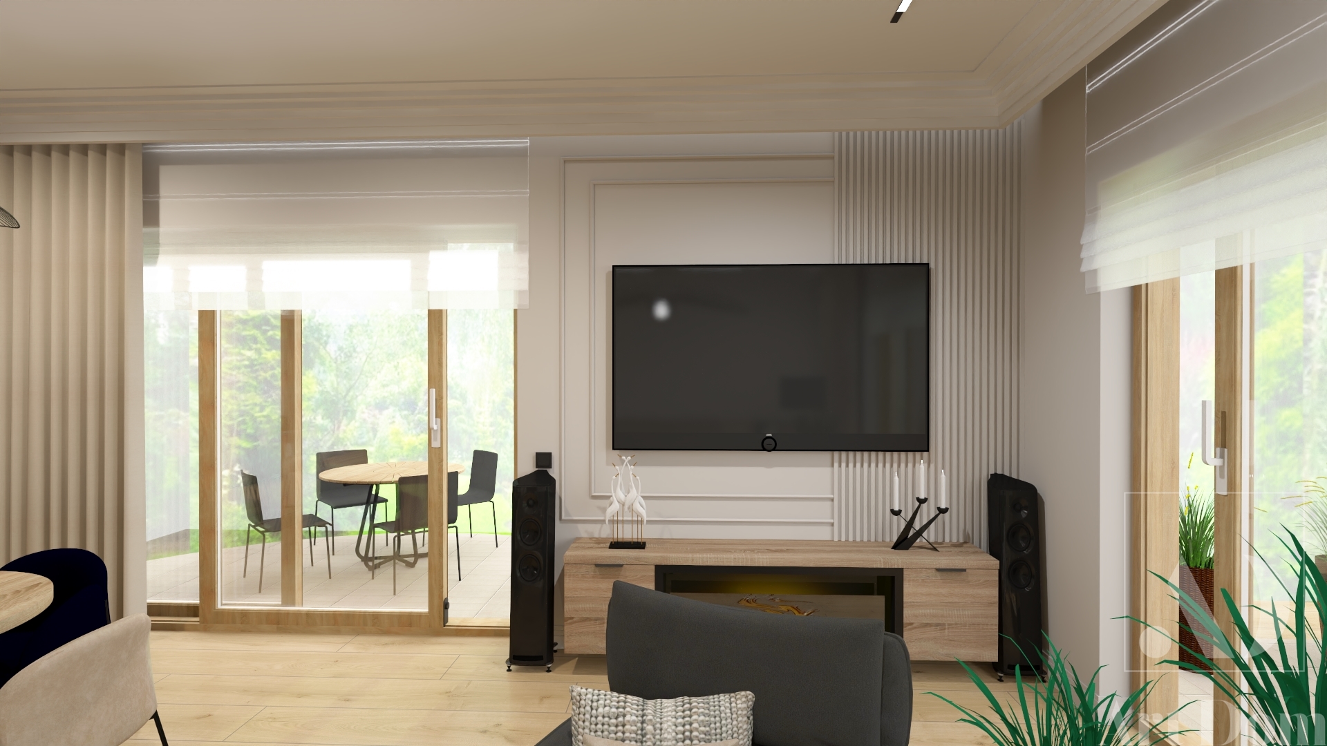 Dla tego projektu zdecydowałam się zamieścić na stronie zarówno wizualizacje, jak i zdjęcia z sesji zdjęciowej, tak żeby była możliwość porównania. Jest to mega ciekawa i bardzo przytulna przestrzeń jednokondygnacyjnego domu jednorodzinnego. Dominuje tu ciepły kolor drewna, który świetnie komponuje się z odcieniami beżu. Całość dekorują czarne dodatki. Przestrzeń powiększają duże lustra i ciekawe przeszklenia. Kuchnia duża i ergonomiczna, z osobnym stołem, gdzie pięcioosobowa rodzina może zjeść posiłki w dniu powszednim. Ścianka telewizyjna zintegrowana z kominkiem elektrycznym. Sypialnię rodziców oraz ich łazienkę ożywiła butelkowa zieleń. Łazienka dzieci została zaprojektowana tak, żeby oparła się próbie czasu. No i pokoje dziecięce, każdy w innym charakterze.