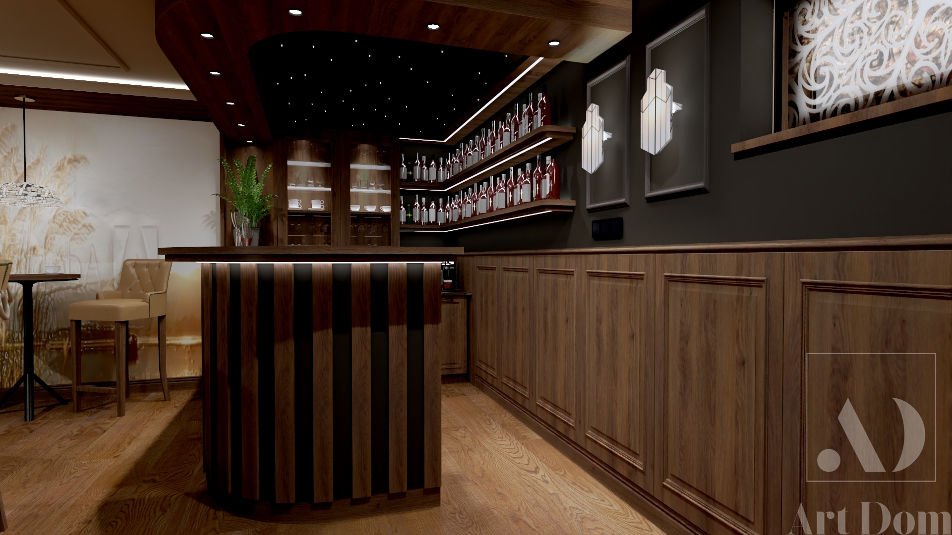W piwnicach rezydencji znalazło się miejsce na miejsce spotkań i relaksu. Serce pomieszczenia ze stołem bilardowym, gdzie delikatnym blaskiem nadają klimatu dwa panele wykonane z podświetlanego marmuru Patagonia. Skórzane fotele chesterfield i klimatyczny bar znajdujące się tuż obok, pozwalają odpocząć i obserwować grę uczestnikom i kibicom. A po drugiej stronie – przytulna sala kinowa z rozłożystymi fotelami i gwieździstym sufitem. Idealna na wspólne seanse.